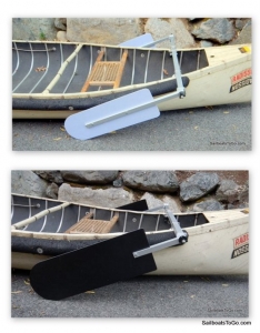 Leeboards help you go straight. Many uses: When motoring clamp this leeboard unit onto your canoe near the front to give much more steering control. Or put at the back when rowing from the middle as tracking fins. Or put up front when paddling from the rear solo to help you go straight. Let's you tack upwind when sailing if you are making your own sail kit (leeboards included with our sail kit). Also available with a single leeboard. (See item 5154 for 1-blade version)